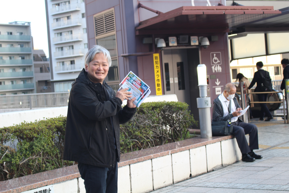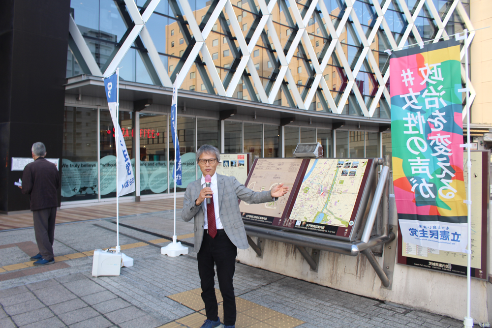 演説会には、党員やパートナーズ、県連代表玉造順一県議会議員、県連副代表滑川友理水戸市議、森智世子水戸市議、鈴木明子那珂市議、小菅勝彦守谷市議がマイクを握り、チラシを配布ました。